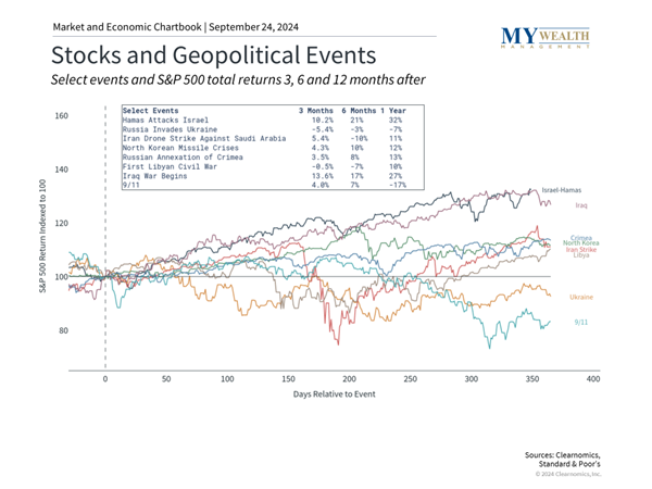 Without minimizing the real-world impact of these conflicts, investors may wonder how they might impact financial markets and the economy. History shows that while geopolitical events can lead to market uncertainty and volatility, their impact on portfolios tends to be short-lived. Markets typically calm as situations evolve and eventually stabilize, leaving broader business cycle trends as the main drivers of performance. Thus, investors should resist making decisions based on headlines and instead focus on their long-term financial goals.